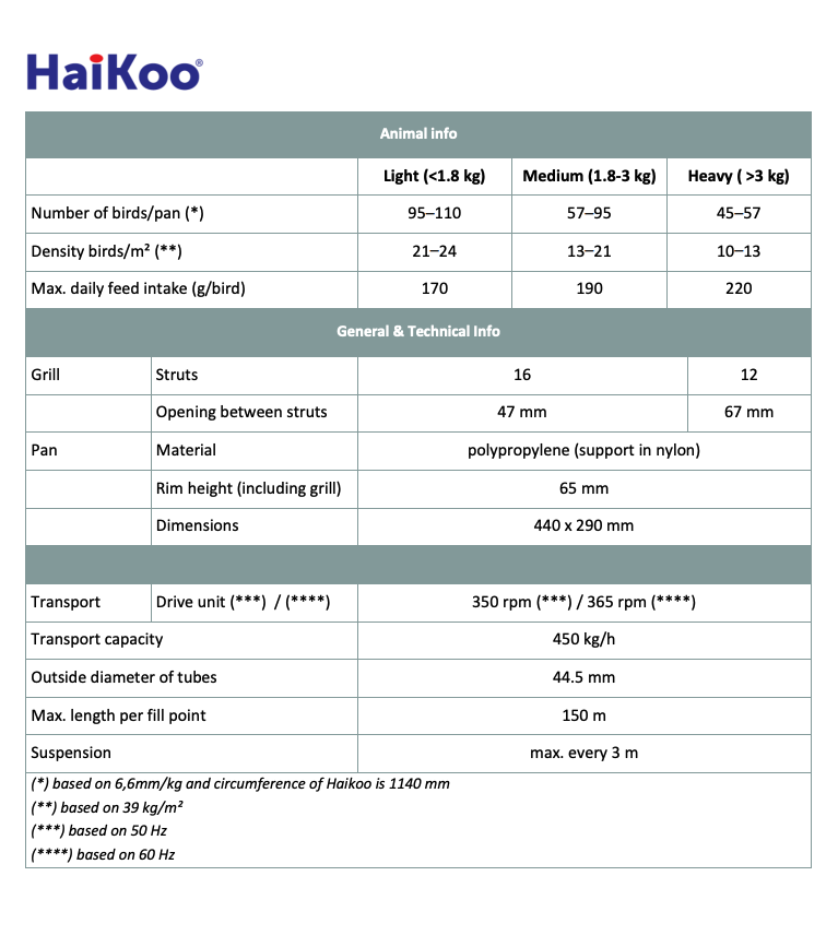 HaiKoo®, piliçler için otomatik bir yemleme tava sistemidir. Bu yemleme sistemi, Roxell’in piliçler için oval şekilli yemleme tavasıdır. Oval şekilli tavalar bir Roxell icadıdır. Oval yemleme tavalarının, kümes kapasitesini diğer tiplere göre çok daha verimli kullandığı kanıtlanmıştır. Bu sayede tavukların hareket alanı daha geniştir.